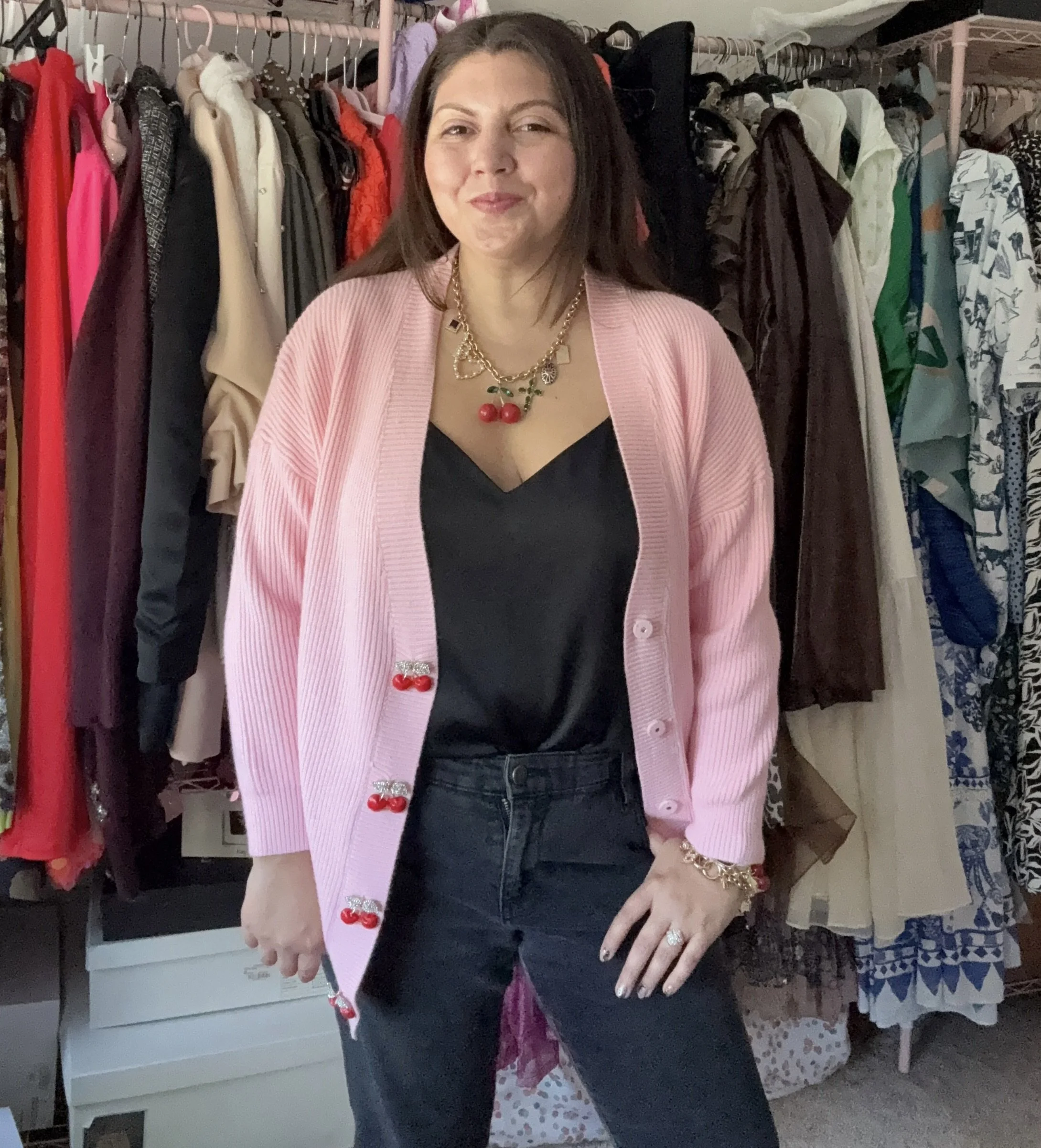 Look 2: Olivia Rubin Cherry Sweater (you can find one for a steal on The Real Real!); denim: Target; jewelry: Lolo Jewels