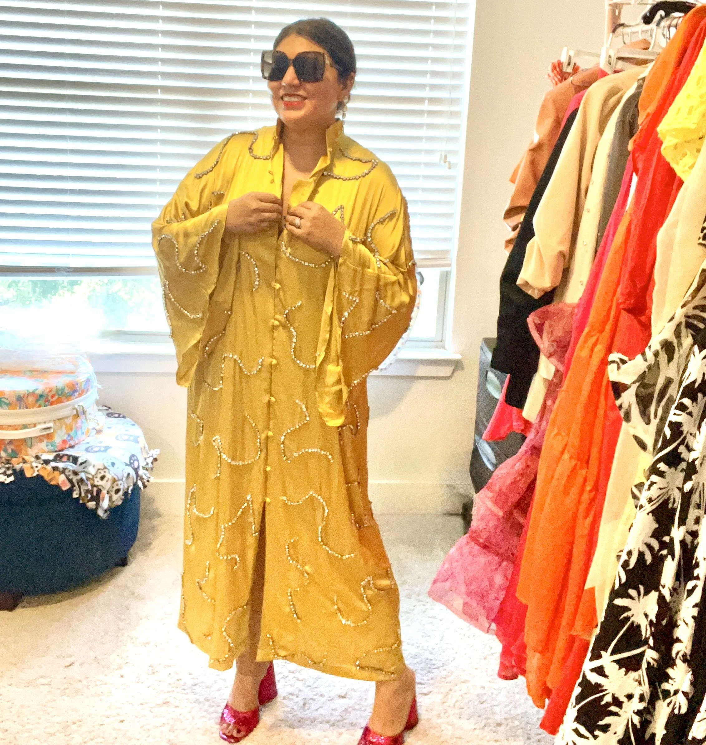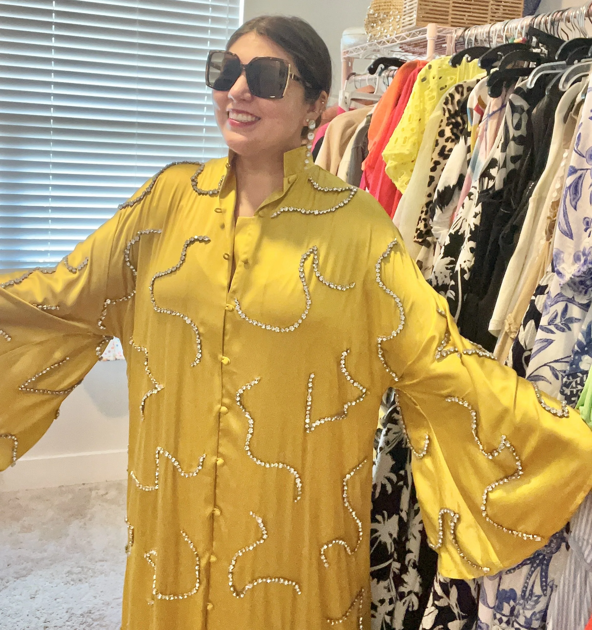 Look 1: Yellow crystal caftan by La Vie Style House; shoes by the Attico