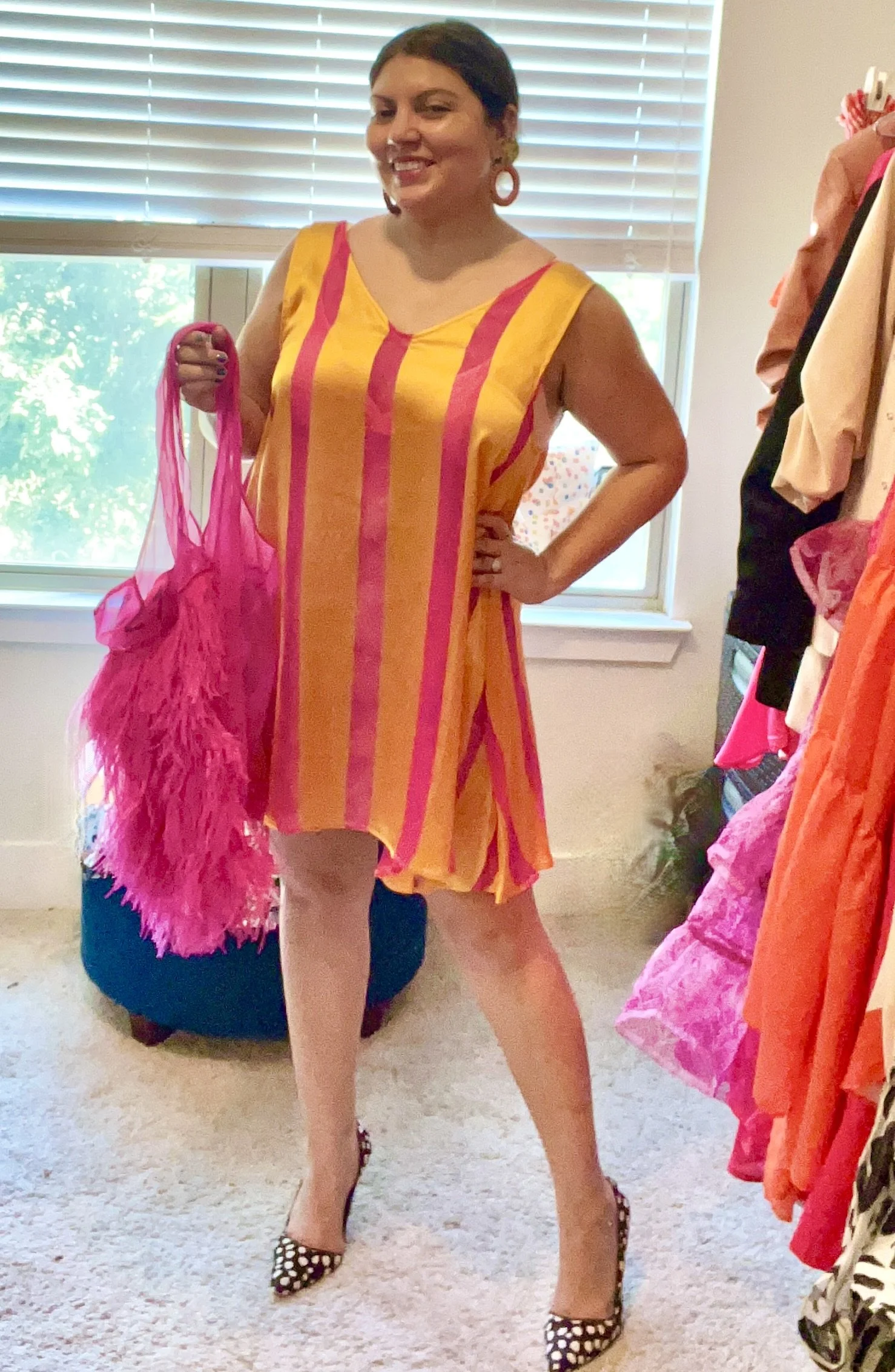 Look 3: Striped Dress from La Vie Style House; feather purse by No. 21; heels by Alice + Olivia (old)