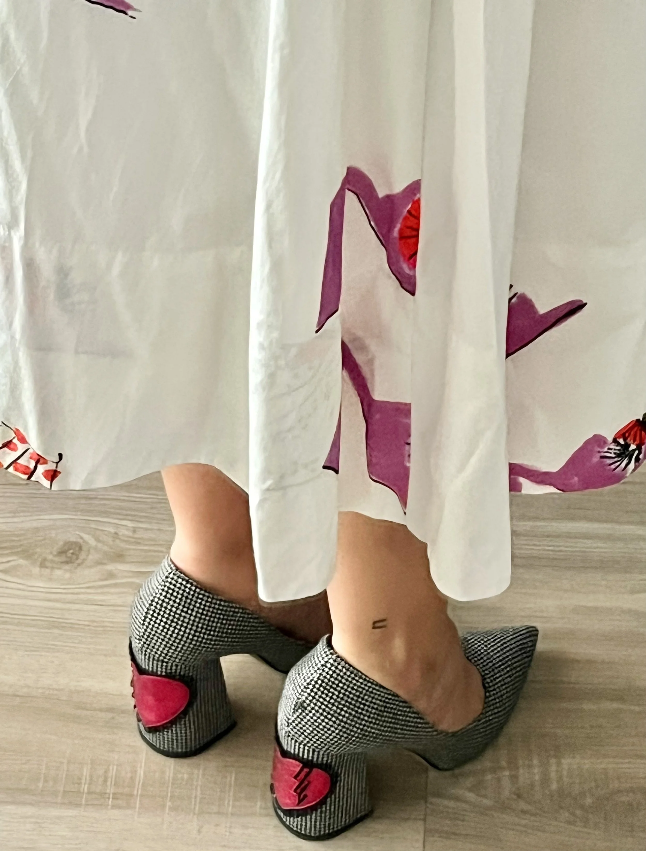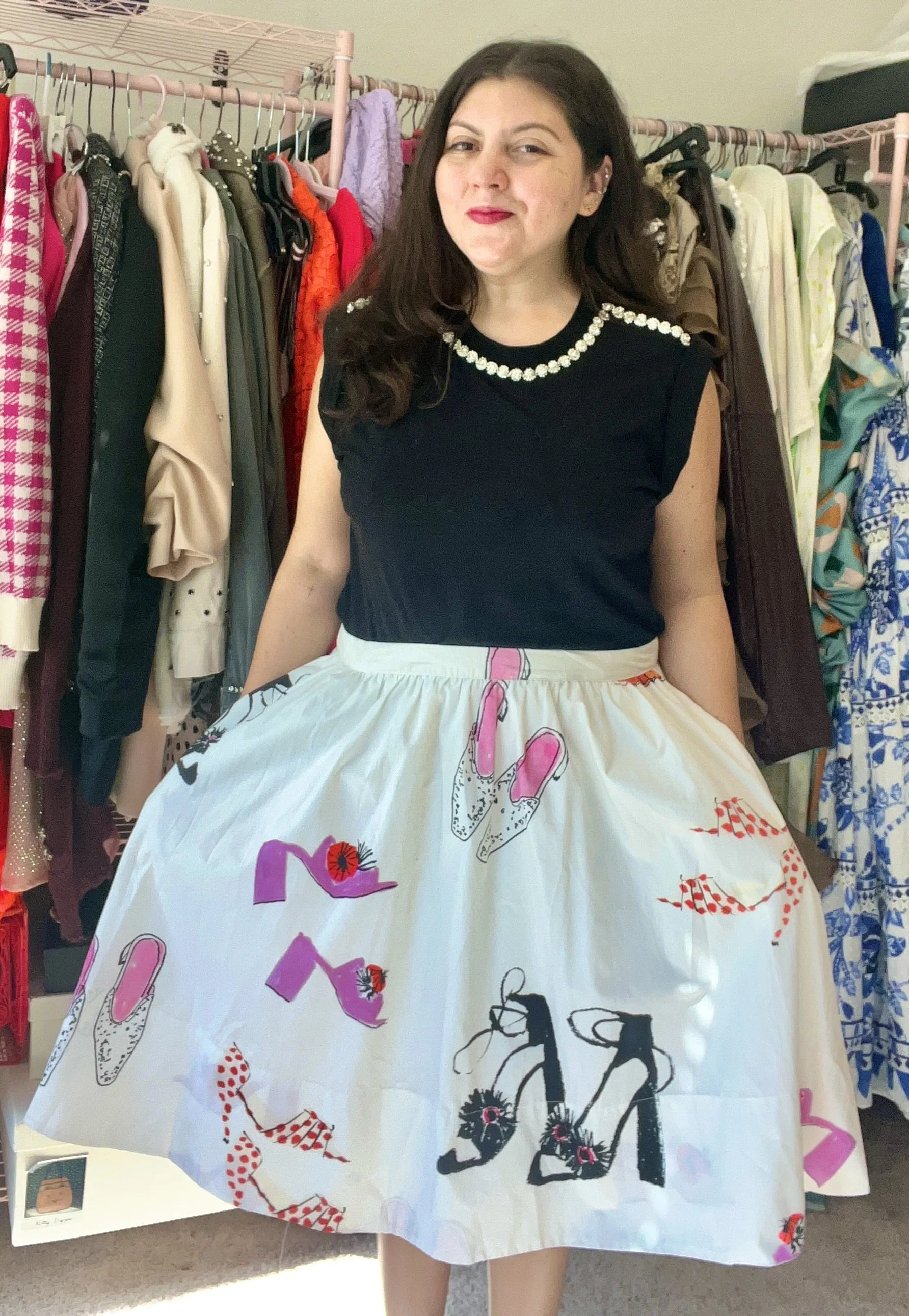 I love shoes. They’re probably my favorite accessory. When I saw that Anthropologie was selling this skirt and dress with a shoe print from Danielle Kroll, I knew I needed it in my life. This skirt will go with pretty much everything, including a TON of the shoes in my closet. I decided to pair it with a Cinq a Sept top, and Charlotte Olympia heels.
